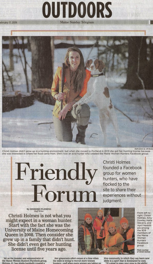 News Click to Preorder Always Game Mainer Builds one of the largest networks of female hunters in the nation Machias woman completes thru-hike of Appalachian Trail Maine Cabin Masters Season 3 Episode 6: Hook, Line, and Sinker Islandport Press: In Maine, You Can’t Lockdown Spirit Maine Women Magazine: The Women with Eagle Eyes Maine Sunday Telegram: Friendly Forum Girl Gotta Hike Podcast: Christi Holmes, Registered Maine Guide and Founder of Maine Women Hunters The Morning Buzz Podcast: Christi Holmes – Outdoorswoman, hunt/fish guide, writer Share this: Click to share on X (Opens in new window) X Click to share on Facebook (Opens in new window) Facebook Like Loading...